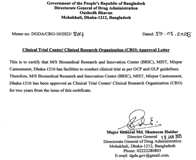On January 19, 2025, the center received official approval from the DGDA to conduct research activities. As a result of this approval, the BME Department's center at MIST has now been listed under the DGDA, similar to other authorized institutions and organizations.