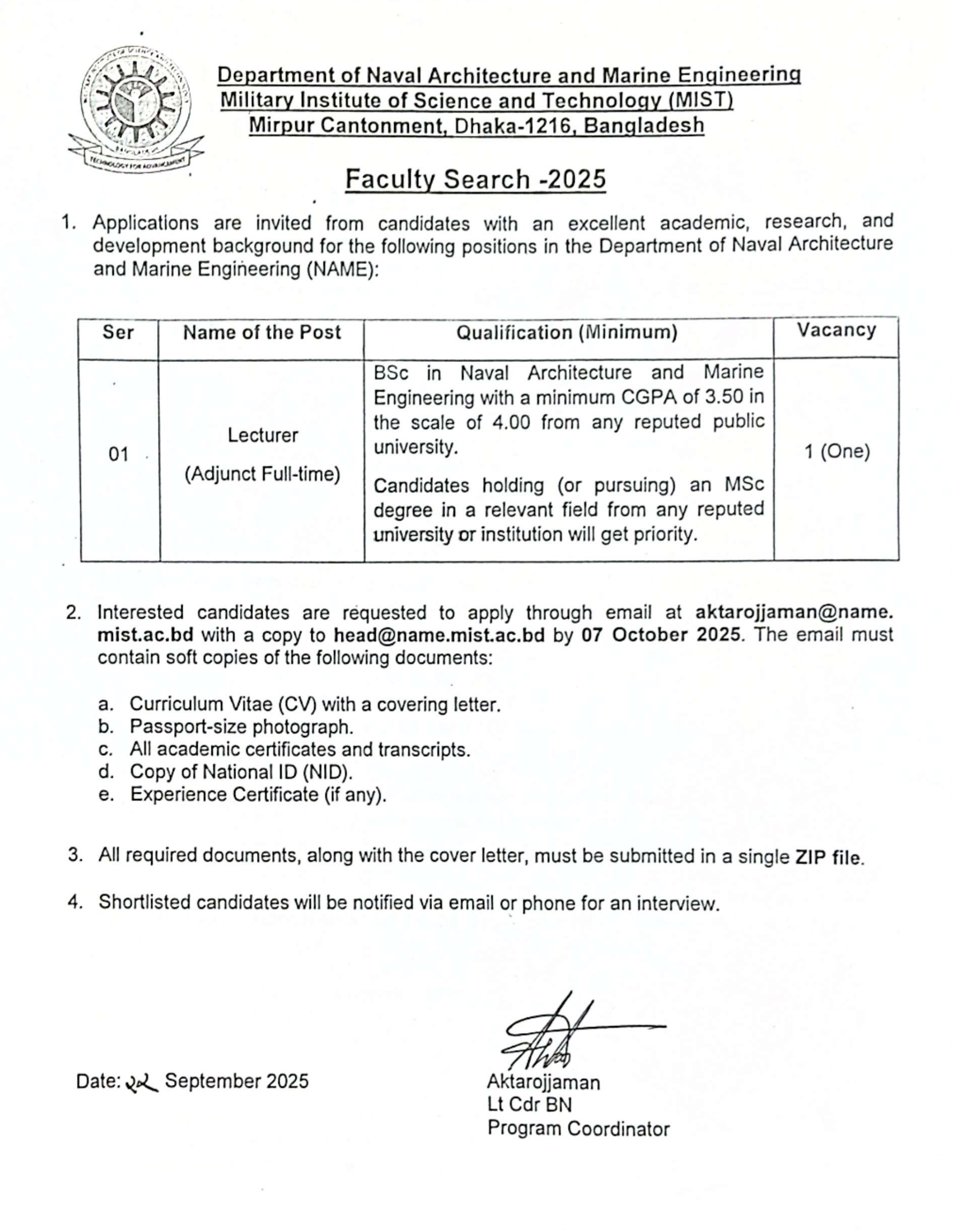 1. Lecturer (Adjunct full-time) Circular for UG Program
